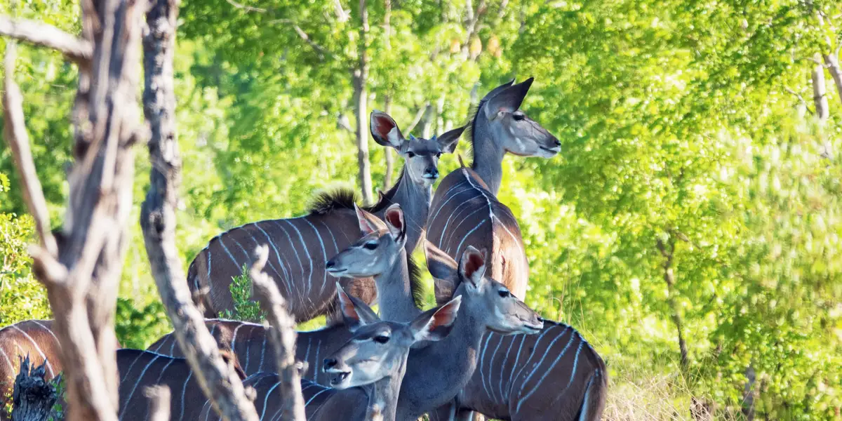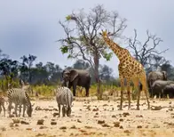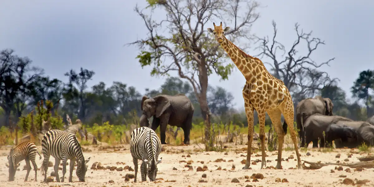 Por su gran extensión, este parque, posee una gran variedad de paisajes, que van desde llanuras desérticas en su parte sur que se unen al desierto del Kalahari, hasta bosques tupidos y colinas de granito. Pero en su mayor parte está formado por extensiones de sabana y bosques de teca y mopane. En la magnífica llanura de “Mbiza” nos encontramos las palmeras Ilala, creando un paisaje espectacular. Dispersas por la extensión del parque existen muchas plataformas de avistamiento, situadas cerca de las charcas, donde es posible ver, por ejemplo, a los elefantes que se acercan a beber, jugar y bañarse.